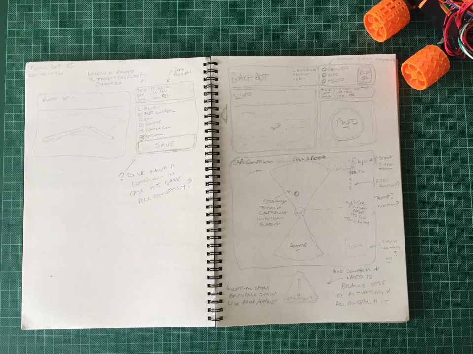 Had a spare moment so sketched out the first version of the UI design for the web interface to control V3. Should be pretty simple to code up most of it. There are a few bits that might be a bit tricky - the combined steering and throttle control is one of them. Need to run it by Rohan and get his ideas.